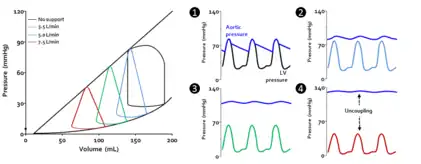 Acute cardiac unloading decreases the workload of and the oxygen demand of the heart. This can be visualized as an overall decrease in the PVA of the PV loop.[3][2] Mechanical unloading of the heart by a percutaneous ventricular support device such as the Impella device can achieve this in two ways. First, the device is a continuous flow device. It directly aspirates blood from the ventricle into the aorta. This decreases the preload and results in a left-shift and loss of the normal isovolumic contraction line.[2]