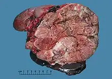 | Micrograph of an adrenocortical carcinoma (left of image – dark blue) and the adrenal cortex it arose from (right-top of image – pink/light blue). Benign adrenal medulla is present (right-middle of image – gray/blue). H&E stain. | |
