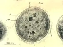 Aeromonas salmonicida is a Gram-negative, facultatively anaerobic, nonmotile bacterium. It is rod-shaped, about 1.3–2.0 by 0.8–1.3 μm in size, and grows optimally at temperatures between 22 and 25 °C.[1][2] The bacterium readily ferments and oxidizes glucose, and is catalase- and cytochrome oxidase-positive. Its molecular properties include a special surface protein array called the A-layer, which is believed to be responsible for the bacterium's virulent traits, and lipopolysaccharide, the cells' major cell envelope antigen.[3] The A-layer consists of a 50-kD protein, and provides protection to the bacterium. The lipopolysaccharide consists of three moieties: lipid A, a core oligosaccharide, and an O-polysaccharide (O-antigen). The extracellular products of A. salmonicida consist of 25 proteins, enzymes, and toxins, and many more.[3] In addition, the genome is composed of a single circular chromosome (4,702,402 bp), with two large and three small plasmids. The chromosome yields 58.5% of G+C pairs, has 4086 encoding proteins, and totals 4388 genes.[4]