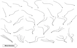 Ballooning, sometimes called kiting, is a process by which spiders, and some other small invertebrates, move through the air by releasing one or more gossamer threads to catch the wind, causing them to become airborne at the mercy of air currents.[64][65] A spider (usually limited to individuals of a small species), or spiderling after hatching,[66] will climb as high as it can, stand on raised legs with its abdomen pointed upwards ("tiptoeing"),[67] and then release several silk threads from its spinnerets into the air. These automatically form a triangular shaped parachute[68] which carries the spider away on updrafts of winds where even the slightest of breezes will disperse the arachnid.[67][68] The flexibility of their silk draglines can aid the aerodynamics of their flight, causing the spiders to drift an unpredictable and sometimes long distance.[69] Even atmospheric samples collected from balloons at 5 km (3.1 mi) altitude and ships mid-ocean have reported spider landings. Mortality is high.[70]