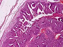 Histologically, the tumor exhibits a mixed tubuloalveolar and papillary pattern, focal squamous metaplasia, fibrocollagenous stroma, and a grenz zone.[5] In situ hybridization for HPV42 DNA may help in differentiating this cancer from related tumors.[6]