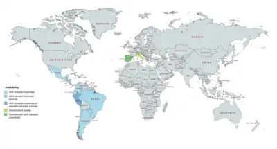 DHPA has been available for use both alone and in combination with estrogens.[8][9][26][63][64][7] It was marketed alone under the brand name Neolutin Depositum in Italy, but this preparation was discontinued.[8][7][58] DHPA has been marketed in combination with estradiol enantate (E2-EN) as a combined injectable contraceptive in at least 19 countries, mostly in Latin America.[5][18][24][16][8][9][63][64] A few different preparations, with varying doses of E2-EN and DHPA and varying availability, have been introduced.[24][5][18][23][26][4][55] These formulations have the following approval and availability († = discontinued in this country):[8][9][63][64][23][24][5][18][4]