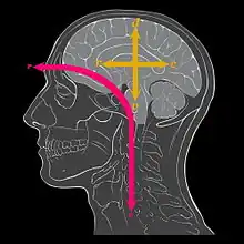 Standard anatomical planes and anatomical axes are used to describe structures in animals. In humans and many other primates the axis of the central nervous system is not straight, but bent to allow for forward vision when the body is vertical. This means that differences in terminology are needed to reflect the differences between the brains of primates and the brains of nearly all other vertebrates. For example, to describe the human brain, "rostral" still means "towards the beak or snout (Latin rostrum)", or at any rate, the interior of the cranial cavity just behind the face. "Caudal" means "towards the tail (Latin cauda"), but not "towards the back of the cranial cavity", which is "posterior" (behind, in ordinary motion). The rostro-caudal axis of the human central nervous system (magenta in the diagram) makes a near 90° bend at the level of the midbrain and continues through the brain-stem and spinal cord. In human anatomy, the occipital lobes and the back of the head are posterior but not caudal to the frontal lobes and the face.