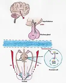- The synthesis of testosterone is mediated by a chain of processes that start in the brain. When the body detects a low level of testosterone, the hypothalamus starts to produce LHRH. LHRH activates the synthesis of LH (Luteinizing hormone) within the pituitary gland. LH induces testosterone synthesis within the testicles.[10] There are two different medicines, LHRH agonists and antagonists, which both lower the amount of testosterone made by the testicles. They work by inhibiting the formation of LH in the pituitary gland. The LHRH agonists produce a sudden increase on levels of testosterone followed by a huge falling, process called flare, whereas LHRH antagonists decrease directly the amount of testosterone. LHRH agonists and antagonists used in androgen deprivation therapy include leuprorelin (leuprolide), goserelin, triptorelin, histrelin, buserelin, and degarelix.