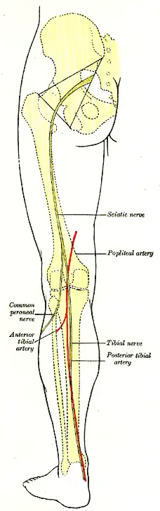 Schema of the arteries of the thigh. Anterior tibial artery is labeled at the bottom.- Anterior tibial artery