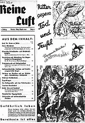 Well-known health magazines like the Gesundes Volk (Healthy People),[33] Volksgesundheit (People's Health) and Gesundes Leben (Healthy Life)[54] also published warnings about the health consequences of smoking[33][54] and posters showing the harmful effects of tobacco were displayed.[33] Some anti-smoking posters were unapproved and censured by the government.[9] Editorials discussing the issue of smoking and its effects were published in newspapers.[55] Articles advocating nonsmoking were also published in the magazines Die Genussgifte (The Recreational Stimulants), Auf der Wacht (On the Guard) and Reine Luft (Clean Air).[56] Out of these magazines, Reine Luft was the main journal of the anti-tobacco movement.[1][8] Karl Astel's Institute for Tobacco Hazards Research at Jena University purchased and distributed hundreds of reprints from Reine Luft.[8] The magazine was published by tobacco control activists; it was later, in 1941, ordered by the propaganda ministry to moderate its tone and submit all material for pre-approval.[9]