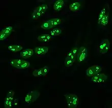 - ↑ Tan EM, Feltkamp, TE, Smolen, JS, Butcher, B, Dawkins, R, Fritzler, MJ, Gordon, T, Hardin, JA, Kalden, JR, Lahita, RG, Maini, RN, McDougal, JS, Rothfield, NF, Smeenk, RJ, Takasaki, Y, Wiik, A, Wilson, MR, Koziol, JA (September 1997). "Range of antinuclear antibodies in "healthy" individuals". Arthritis and Rheumatism. 40 (9): 1601–11. doi:10.1002/art.1780400909. PMID 9324014.