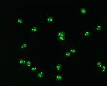 Indirect immunofluorescence is one of the most commonly used tests for ANAs. Typically, HEp-2 cells are used as a substrate to detect the antibodies in human serum. Microscope slides are coated with HEp-2 cells and the serum is incubated with the cells. If the said and targeted antibodies are present then they will bind to the antigens on the cells; in the case of ANAs, the antibodies will bind to the nucleus. These can be visualised by adding a fluorescent tagged (usually FITC or rhodopsin B) anti-human antibody that binds to the antibodies. The molecule will fluoresce when a specific wavelength of light shines on it, which can be seen under the microscope. Depending on the antibody present in the human serum and the localisation of the antigen in the cell, distinct patterns of fluorescence will be seen on the HEp-2 cells.[53][54] Levels of antibodies are analysed by performing dilutions on blood serum. An ANA test is considered positive if fluorescence is seen at a titre of 1:40/1:80. Higher titres are more clinically significant as low positives (≤1:160) are found in up to 20% of healthy individuals, especially the elderly. Only around 5% of the healthy population have ANA titres of 1:160 or higher.[8][55]