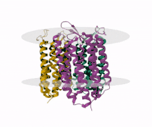 AR3 is expressed by Halorubrum sodomense.[9] The organism was first identified in the Dead Sea in 1980 and requires a higher concentration of Mg2+ ions for growth than related halophiles.[15] The aop3 gene was cloned by Ihara and colleagues at Nagoya University in 1999 and the protein was found to share 59% sequence identity with bacteriorhodopsin.[9] The crystal structure of AR3 was solved by Anthony Watts at Oxford University and Isabel Moraes at the National Physical Laboratory, together with collaborators at Diamond Light Source.[16]