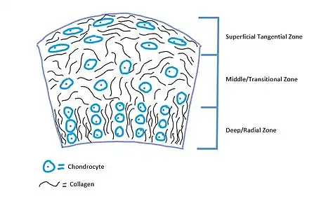 There are three structural zones in articular cartilage including a superficial tangential zone, a middle transitional zone and a deep zone. In the tangential zone, collagen fibers are aligned parallel to the surface and become gradually randomly aligned while moving into the deep zone. Collagen fibers in the superficial zone are aligned parallel to the surface in order to restrict shear stresses. Similarly, collagen fibers are aligned perpendicular to the surface in the deep zone in order to restrict compressive forces.[5] Between bone and the deep zone lies calcified cartilage. Cell arrangement also varies between the zones, in deeper zones chondrocytes are stacked into columns while in the superficial zones they are arranged randomly.[3] In the superficial regions the cells are also more elongated, while in deeper zones they are more spherical in nature.[5]
