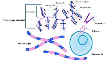 - Proteoglycans: Proteoglycans are the second most abundant macromolecule in the ECM of cartilage.[5] Proteoglycans consist of a linker protein along with a core protein to which glycosaminoglycans (GAGs) attach. The most common GAGs are chondroitin sulfate and keratin sulfate. Proteoglycans attach to a central chain, usually hyaluronic acid, via a linker protein, to create larger proteoglycan aggregates.[3] Proteoglycans are hydrophilic and therefore attract and restrain water molecules. This provides cartilage with its intrinsic ability to resist compression.