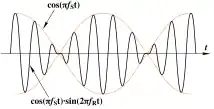 Because every other burst in the modulation pattern is inverted, each peak is replaced by a trough and vice versa. The envelope is perceived to have twice the frequency of the modulating cosine, which means the audible beat frequency (if it is in the audible range) is:[4]