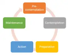 Behavior change programs tend to focus on a few behavioral change theories which gained ground in the 1980s. These theories share a major commonality in defining individual actions as the locus of change. Behavior change programs that are usually focused on activities that help a person or a community to reflect upon their risk behaviors and change them to reduce their risk and vulnerability are known as interventions. Examples include: "transtheoretical (stages of change) model of behavior change", "theory of reasoned action", "health belief model", "theory of planned behavior",[11] diffusion of innovation",[12] and the health action process approach.[13] Developments in health behavior change theories since the late 1990s have focused on incorporating disparate theories of health behavior change into a single unified theory.[14][15]