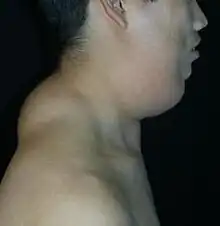 Cosmetic disfigurement due to the fat deposition in the cervicothoracic region results in a "pseudoathletic appearance," resembling the Italian statue Warrior of Capestrano and carvings of Queen of Punt (Egypt).[10][17] The fat deposited around the front of the neck is known as Madelung's collar or horse collar.[13][5] Fat deposited on the back of the neck between the shoulder blades is known as a dorsocervical fat pad or buffalo hump.[13][18] Fat deposited in the parotid region is known as hamster cheeks.[10]