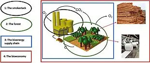 The climate impact of bioenergy varies considerably depending on where biomass feedstocks come from and how they are grown.[3] For example, burning wood for energy releases carbon dioxide. Those emissions can be significantly offset if the trees that were harvested are replaced by new trees in a well-managed forest, as the new trees will remove carbon dioxide from the air as they grow.[4] However, the farming of biomass feedstocks can reduce biodiversity, degrade soils and take land out of food production.[5] It may also consume water for irrigation and fertilisers.[6][7]