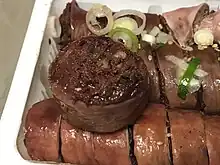 Blood as food is the usage of blood in food, religiously and culturally. Many cultures consume blood, often in combination with meat. The blood may be in the form of blood sausage, as a thickener for sauces, a cured salted form for times of food scarcity, or in a blood soup.[1] This is a product from domesticated animals, obtained at a place and time where the blood can run into a container and be swiftly consumed or processed. In many cultures, the animal is slaughtered. In some cultures, blood is a taboo food.