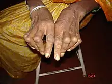 Boutonniere deformity is a deformed position of the fingers or toes, in which the joint nearest the knuckle (the proximal interphalangeal joint, or PIP) is permanently bent toward the palm while the farthest joint (the distal interphalangeal joint, or DIP) is bent back away (PIP flexion with DIP hyperextension). Causes include injury,[1] inflammatory conditions like rheumatoid arthritis, psoriatic arthritis, and genetic conditions like Ehlers-Danlos syndrome.[2]