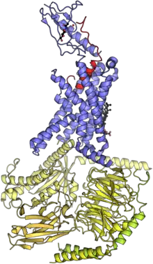 ![]() Human calcitonin (black) bound to the calcitonin receptor. PDB: 7TYO | |||||||