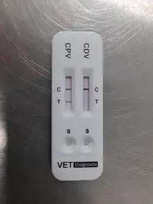 - ↑ Oh J, Ha G, Cho Y, Kim M, An D, Hwang K, Lim Y, Park B, Kang B, Song D (2006). "One-Step Immunochromatography Assay Kit for Detecting Antibodies to Canine Parvovirus". Clin. Vaccine Immunol. 13 (4): 520–4. doi:10.1128/CVI.13.4.520-524.2006. PMC 1459639. PMID 16603622.
