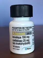 Carbidopa/levodopa, also known as levocarb and co-careldopa, is the combination of the two medications carbidopa and levodopa.[6] It is primarily used to manage the symptoms of Parkinson's disease, but it does not slow down the disease or stop it from getting worse.[6] It is taken by mouth.[6] It can take two to three weeks of treatment before benefits are seen.[7] Each dose then begins working in about ten minutes to two hours with a duration of effect of about five hours.[7][8][9]