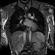 Cardiac magnetic resonance imaging (cardiac MRI, CMR), also known as cardiovascular MRI, is a magnetic resonance imaging (MRI) technology used for non-invasive assessment of the function and structure of the cardiovascular system.[2] Conditions in which it is performed include congenital heart disease, cardiomyopathies and valvular heart disease, diseases of the aorta such as dissection, aneurysm and coarctation, coronary heart disease. It can also be used to look at pulmonary veins.[3]
