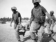 All members of the US Armed Forces today are trained in some form of basic first aid. While lacking advanced life saving equipment and medical personnel in regular vehicles, all personnel today enter the combat zone with an Improved First Aid Kit (IFAK)[6] on their equipment. The IFAK has basic medical supplies such as bandages, a tourniquet, and QuikClot gauze. Most units have stretchers and burn blankets in their vehicles. In addition each unit is staffed by a corpsman or medic. These professionals are trained in Tactical Combat Casualty Care.[7]