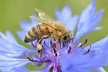 The pollen of Centaurea cyanus is used by several different insect species. Insects of the orders Hymenoptera and Diptera are particularly attracted by the flower.[17] As Centaurea cyanus is a self-incompatible species, it needs external pollination. The nectar of Centaurea cyanus is very sweet with a sugar content of 34%. Due to its high sugar production of up to 0.2 mg sugar per day and flower, the species is highly appreciated by beekeepers.[18]