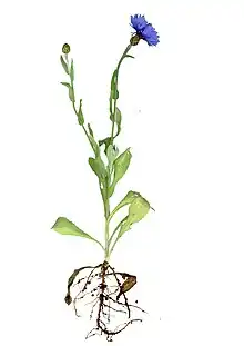 Centaurea cyanus is an annual plant growing to 20–100 centimetres (8–39 in) tall, with grey-green branched stems. The leaves are lanceolate and 3–10 cm (1–4 in) long.[2] The flowers are most commonly an intense blue colour and arranged in flowerheads (capitula) of 1.5–3 cm diameter, with a ring of a few large, spreading ray florets surrounding a central cluster of disc florets. The blue pigment is protocyanin, which in roses is red.[3] Fruits are approx. 3.5 mm long with 2–3 mm-long pappus bristles.[4] It flowers all summer.[5]