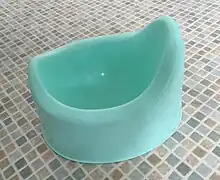The term "potty" is usually used to refer to the small, toilet-shaped devices made especially for children training to use the toilet, also called potty training, which are similar to chamber pots.[11] These "potties" are generally a large plastic bowl with an ergonomically designed back and front to protect against splashes. They may have a built-in handle or grasp at the back to allow easy emptying and a non-slip bottom to prevent the child from sliding while in use. Some are given bright colors, and others may feature gentle or unoffensive drawings or cartoon characters. In many cases they are used since it is difficult for children to maneuver themselves up onto the normal toilet; in addition the larger opening in the regular toilet is much too wide for a child to sit over comfortably and can be intimidating when they first start learning.[12] The size of a potty chair means they can be packed away in a bag for days out or when camping with young children.