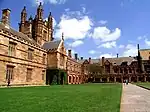 The northern facade of the building was designed in sandstone, reflecting the Gothic architecture of the nearby St John's College. The main southern exterior, which looks out onto the Centenary Institute, was designed primarily in glass and aluminium.[11] The building features a large high-tech teaching "X-Lab", capable of hosting 8 different practical classes concurrently, multipurpose teaching spaces, microscopy teaching labs, study pods, a 360-seat auditorium and a café.[12] Clinical facilities include a whole-body calorimeter, metabolic kitchen, exercise physiology gymnasiums, physical testing facilities, phlebotomy bays, biobank, clinical and pre-clinical imaging facilities including one of the world's only 7T and 4T MRIs, CT, X-ray and ultrasound; long-term stay beds, wet and dry research labs and more.[13][14][15] Research facilities include seven open-plan laboratories with adjacent open-plan office spaces and associated support rooms, capable of each hosting 10 research groups, an animal house facility, and core facilities in cellular imaging and super-resolution microscopy, pre-clinical and clinical imaging, cytometry, genomics and proteomics.
