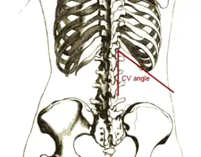 The CVA is an anatomic concept of the relationship of the 12th rib to the transverse processes of the lumbar vertebrae.[1] There is one CVA on each side of the spine.[2] The lateral part of the CVA is formed by the lower border of the 12th rib, and the medial part of the CVA is formed by the transverse processes of the lumbar vertebrae.[1] The CVA is distinct from the costovertebral joints.[2]