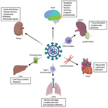 The virus can cause acute myocardial injury and chronic damage to the cardiovascular system.[145][146] An acute cardiac injury was found in 12% of infected people admitted to the hospital in Wuhan, China,[147] and is more frequent in severe disease.[148] Rates of cardiovascular symptoms are high, owing to the systemic inflammatory response and immune system disorders during disease progression, but acute myocardial injuries may also be related to ACE2 receptors in the heart.[146] ACE2 receptors are highly expressed in the heart and are involved in heart function.[146][149]