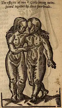 Apart from that, Sebastian Münster’s Cosmographia universalis provides the true first account of craniopagus twins who happened to live for ten years, exceeding many expectations during that time.[35] He describes the set of twins as being a unique malformation and a punishment from their mother's mistake. In French barber surgeon Ambroise Paré’s 16th-century book, On Monsters and Marvels, various types of "supernatural" twinning are illustrated and described as "monstrous and marvelous creatures that proceed from the judgment of God", suggesting that conjoined twins and specifically craniopagus twins were viewed as literal monsters in the 16th century.[36]