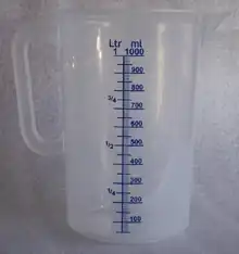 ![]() A measuring cup holding 1000 cubic centimetres, that is one litre (1 L) or 1000 millilitres (1000 mL) | |