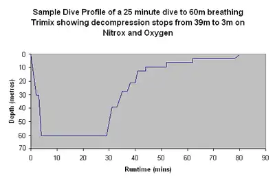 - Saw-tooth dive profile: In a saw tooth profile the diver ascends and descends a number of times during the dive. Each ascent and descent increases the risk of decompression sickness if there are any bubbles already in the diver's tissues.[126][127][128] The increase in risk depends on the ascent rate, magnitude and duration of the upwards excursion, the saturation levels of the tissues, and to some extent the time spent after returning to depth. Accurate assessment of the increase of risk is not currently (2016) possible. Dive profiles with multiple complete or incomplete ascents are known to produce higher post-dive venous bubble counts, measured by Doppler ultrasound, than similar profiles at relatively constant depth.[129]