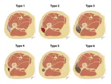 The Mellado-Bencardino classification can be used to describe a Morel-Lavallée lesion based on its MRI.[5] The classification categorizes the lesions into types.[8] The classification has six stages listed as Type I to Type VI.[5] The types do not align with specific treatments or outcomes.[4][8] The stages are based on multiple factors that can be observed on the lesion's MRI.[5] These factors include the following: the shape of the lesion, specific MRI features, and whether a capsule is present.[5][8]