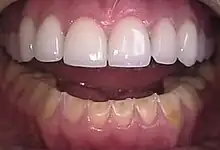 Intrinsic dental erosion, also known as perimolysis, is the process whereby gastric acid from the stomach comes into contact with the teeth.[14] This is often secondary to conditions such as anorexia nervosa, bulimia nervosa, gastroesophageal reflux disease (GERD) and rumination syndrome.[11][14] Dental erosion can also occur by non-extrinsic factors. There is evidence linking eating disorders with a range of oral health problems including dental erosion, caries and xerostomia. Reduced salivary flow rate, a common symptom of bulimia, predisposes an individual to dental erosion due to increased vulnerability to the effects of acidic food and drinks. Self-induced vomiting increases the risk of dental erosion by a factor of 5.5 compared to healthy controls. Lesions are most commonly found on the palatal surfaces of the teeth, followed by the occlusal and then the buccal surfaces.[15] The main cause of GERD is increased acid production by the stomach.[14] This is not exclusive to adults, as GERD and other gastrointestinal disorders may cause dental erosions in children.[16]