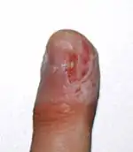Skin chewing can be bolstered by times of apprehension and other unpleasant events.[8] Blisters in particular can cause a feeling of desire to pull or bite off the affected skin and nails (since the skin is dead, thus easily pulled off), which could be detrimental, causing infection. Another disorder, known as excoriation disorder, the repetitive action of uncontrollably picking at one's skin, can sometimes accompany dermatophagia. Dermatophagia differs from excoriation disorder in that the repetitive motion affected persons partake in is the biting of the skin.[9] People who have dermatophagia can also be prone to infection as when they bite their fingers so frequently, they make themselves vulnerable to bacteria seeping in and causing infection. Dermatophagia can be considered a "sister" disorder to trichophagia, which involves compulsively biting and eating one's hair.[10]