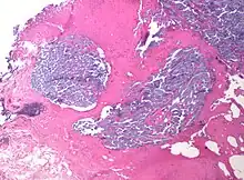 Clinical presentation of a lump in the breast is histologically viewed as a collagenous tumor or desmoplastic response created by myofibroblasts of the tumor stroma.[18] Proposed mechanisms of activation of myofibroblasts are by immune cytokine signaling, microvascular injury, or paracrine signaling by tumor cells.[18]