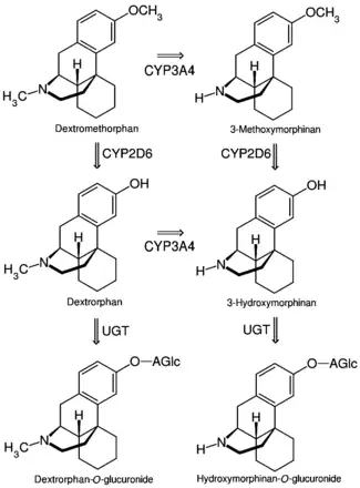 - ↑ Schmider J, Greenblatt DJ, Fogelman SM, von Moltke LL, Shader RI (April 1997). "Metabolism of dextromethorphan in vitro: involvement of cytochromes P450 2D6 and 3A3/4, with a possible role of 2E1". Biopharmaceutics & Drug Disposition. 18 (3): 227–240. doi:10.1002/(SICI)1099-081X(199704)18:3<227::AID-BDD18>3.0.CO;2-L. PMID 9113345. S2CID 5638973.