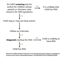 Screening tools include the Modified Checklist for Autism in Toddlers (M-CHAT), the Early Screening of Autistic Traits Questionnaire, and the First Year Inventory; initial data on M-CHAT and its predecessor, the Checklist for Autism in Toddlers (CHAT), on children aged 18–30 months suggests that it is best used in a clinical setting and that it has low sensitivity (many false-negatives) but good specificity (few false-positives).[14] It may be more accurate to precede these tests with a broadband screener that does not distinguish ASD from other developmental disorders.[33] Screening tools designed for one culture's norms for behaviors like eye contact may be inappropriate for a different culture.[34] Although genetic screening for autism is generally still impractical, it can be considered in some cases, such as children with neurological symptoms and dysmorphic features.[35]