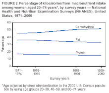 - 1 2 3 4 Centers for Disease Control Prevention (CDC) (February 2004). "Trends in intake of energy and macronutrients—United States, 1971–2000". MMWR. Morbidity and Mortality Weekly Report. 53 (4): 80–2. PMID 14762332.