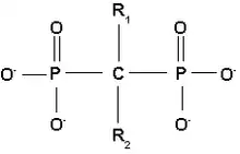 Bisphosphonates mimic the endogenous inorganic pyrophosphate where the oxygen backbone is replaced with carbon (P-C-P for P-O-P). The two additional groups or side chains on the carbon backbone are usually referred to as R1 and R2. R1 is usually a hydroxyl group which enhances the affinity for the calcium by forming a tridentate ligand along with the phosphate groups. The compound can be made more potent by optimizing the structure of the R2 group to best inhibit bone resorption.[13]