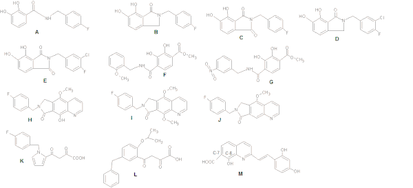 Benard et al (2004) synthesized INIs with a quinoline subunit and an ancillary aromatic ring linked by functionalized spacers such as amide, hydrazide, urea and hydroxyprop-1-en-3-one moiety. They found that the amide group containing derivatives were the most promising ones.[18][19] By synthesizing series of styrylquinones researchers found out that a carboxyl group at C-7, a hydroxylgroup at C-8 in the quinoline subunit and an ancillary phenyl ring (Figure 4: Structure M) are required for inhibition, although alterations of the ring are tolerated. Two hydroxyl groups on the ancillary phenyl ring are also required for inhibitory potency.[18]