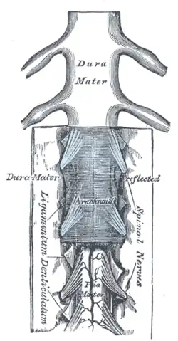- ↑ Sakka, Laurent (2020), "Anatomy of the Spinal Meninges", Spinal Anatomy, vol. 12, no. 2, Springer International Publishing, pp. 403–419, doi:10.1007/978-3-030-20925-4_26, ISBN 978-3-030-20924-7, PMID 29506096, S2CID 242191187