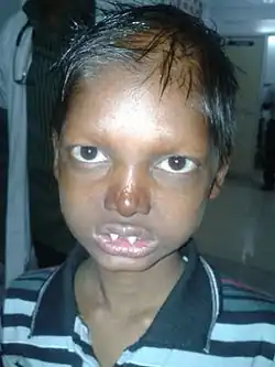 | A patient displaying peg-shaped teeth and sparse hair characteristic of ectodermal dysplasia. | |