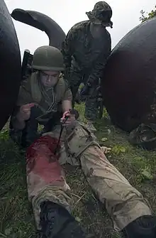 - ↑ Taylor DM, Vater GM, Parker PJ (September 2011). "An evaluation of two tourniquet systems for the control of prehospital lower limb hemorrhage". The Journal of Trauma. 71 (3). Lippincott Williams & Wilkins: 591–595. doi:10.1097/TA.0b013e31820e0e41. PMID 21768905.