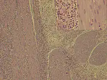 Eosinophilic gastroenteritis (EG or EGE), also known as eosinophilic enteritis,[1] is a rare and heterogeneous condition characterized by patchy or diffuse eosinophilic infiltration of gastrointestinal (GI) tissue, first described by Kaijser in 1937.[2][3] Presentation may vary depending on location as well as depth and extent of bowel wall involvement and usually runs a chronic relapsing course. It can be classified into mucosal, muscular and serosal types based on the depth of involvement.[4][5] Any part of the GI tract can be affected, and isolated biliary tract involvement has also been reported.[6][7] The stomach is the organ most commonly affected, followed by the small intestine and the colon.[8][9]