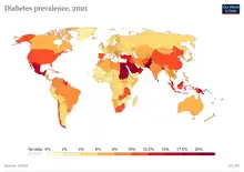 Globally, an estimated 537 million adults are living with diabetes, according to 2019 data from the International Diabetes Federation.[1] Diabetes was the 9th-leading cause of mortality globally in 2020, attributing to over 2 million deaths annually due to diabetes directly, and to kidney disease due to diabetes.[2] The primary causes of type 2 diabetes is diet and physical activity, which can contribute to increased BMI, poor nutrition, hypertension, alcohol use and smoking, while genetics is also a factor.[3] Diabetes prevalence is increasing rapidly; previous 2019 estimates put the number at 463 million people living with diabetes,[4] with the distributions being equal between both sexes incidence peaking around age 55 years old.[5] The number is projected to 643 million by 2030,[1] or 7079 individuals per 100,000, with all regions around the world continue to rise.[5] Type 2 diabetes makes up about 85-90% of all cases.[6][7] Increases in the overall diabetes prevalence rates largely reflect an increase in risk factors for type 2, notably greater longevity and being overweight or obese.[8] The prevalence of African Americans with diabetes is estimated to triple by 2050, while the prevalence of white Americans is estimated to double.[3] The overall prevalence increases with age, with the largest increase in people over 65 years of age.[3] The prevalence of diabetes in America is estimated to increase to 48.3 million by 2050.[3]