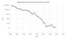 Eradication of dracunculiasis is an ongoing program. Dracunculiasis, or Guinea worm disease, is an infection by the Guinea worm that causes severe pain and open wounds when guinea worms exit the body through the skin.[1] In 1986, there were an estimated 3.5 million cases of Guinea worm in 20 endemic nations in Asia and Africa.[2] The number of cases has since been reduced by more than 99.999% to 14 in 2023[3][4] with only six countries remaining: South Sudan, Chad, Mali, Ethiopia, Angola, and Central African Republic.